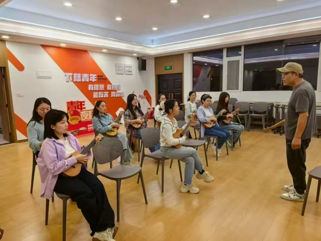 坚持“需求导向、分类施策”原则,通过线上问卷、线下座谈、企业走访等多元渠道建立需求收集机制,构建涵盖思想引领、职业技能、文化素养、兴趣爱好、身心健康五大板块的课程体系。思想引领方面,融入习近平总书记关于青年工作的重要思想、二十届四中全会精神等内容,通过课前微宣讲、理论展板等形式筑牢青年思想根基;职业技能方面,开设 AI 高效办公、短视频制作、求职训练营、公益面试指导等实用课程,大冶市联合人社部门推出就业创业政策解读,黄石港区开展 AI 技能专题培训,助力青年职场赋能;文化传承方面,深挖本土资源,开设阳新布贴、皮影传承、国学书法、茶艺等课程,推动非遗文化在青年群体中传承发展;兴趣健康方面,涵盖古筝、架子鼓、瑜伽、气排球、健身塑形等30余种课程,满足青年休闲减压需求;实用服务方面,联合卫健部门开设“健康大讲堂”“应急救护培训”,下陆区增设亲子沟通课程,全方位覆盖青年生活需求。