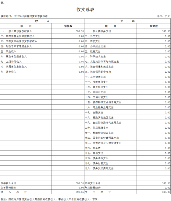 按照综合预算的原则,共青团黄石市委所有收入和支出均纳入部门预算管理。收入包括:一般公共预算拨款收入;支出包括:一般公共服务支出;2026年度收支总预算398.35万元。