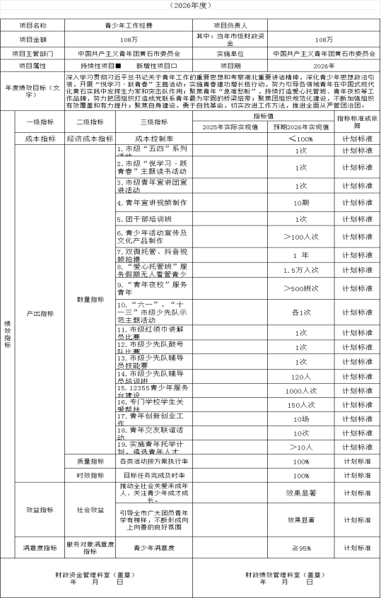 (7)2026年度项目绩效总目标是:深入学习贯彻习近平总书记关于青年工作的重要思想和考察湖北重要讲话精神,深化青少年思想政治引领,开展“悦学习·跃青春”主题活动;实施青春建功增长极行动,努力引导各领域青年在中国式现代化黄石实践中发挥生力军和突击队作用;聚焦青年“急难愁盼”,持续打造爱心托管班等工作品牌,努力把团组织打造成党联系青年最为牢固的桥梁纽带;聚焦团组织规范化建设,不断加强组织有效覆盖和有力提升;聚焦自身建设,勇于自我革命,切实改进工作方法,推进全面从严管团治团。