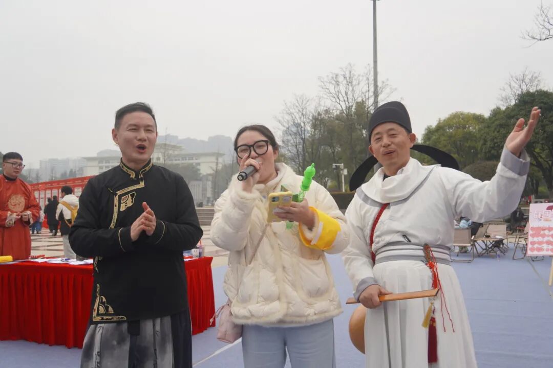 青年与古装演员共读诗词