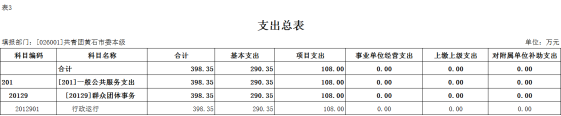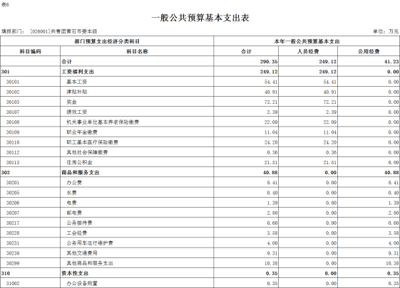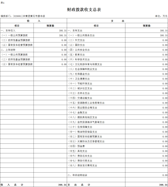 按照综合预算的原则,共青团黄石市委所有收入和支出均纳入部门预算管理。收入包括:一般公共预算拨款收入;支出包括:一般公共服务支出;2026年度收支总预算398.35万元。