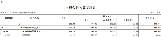 一般公共服务支出(类)群众团体事务(款)行政运行(项)2026年预算数为398.35万元,比上年预算减少5.42万元,下降1.34%。主要原因是本年度增加了驻村帮扶资金。